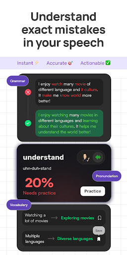 Real-time correction helps users improve their accent and pronunciation accuracy.