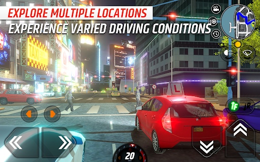 Players can choose from different cars and practice in diverse settings like city streets and highways.