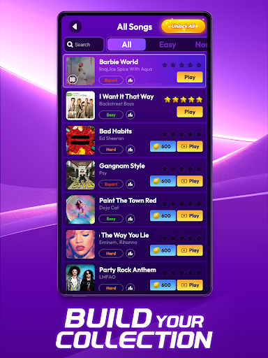 The app features a diverse selection of popular and relaxing piano music that enhances the gaming experience.